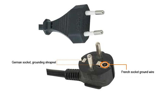 Der runde Stecker verfügt über zwei Erdungsmethoden: Eine ist ein kreisförmiges Erdungsloch und die andere ist ein spezielles Erdungsloch für eine französische Steckdose. 2 ist eine erdungselastische Erdungskomponente von a Deutsche Normsteckdose.