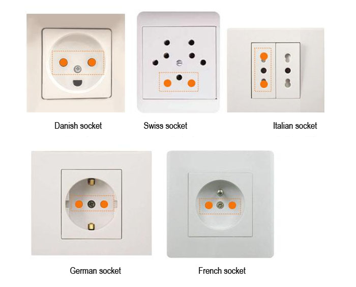 Obwohl es viele europäische Steckdosentypen gibt, haben alle eine Gemeinsamkeit: Der Neutralleiter und der stromführende Leiter sind zweirundige Buchsen (siehe Abbildung unten).
